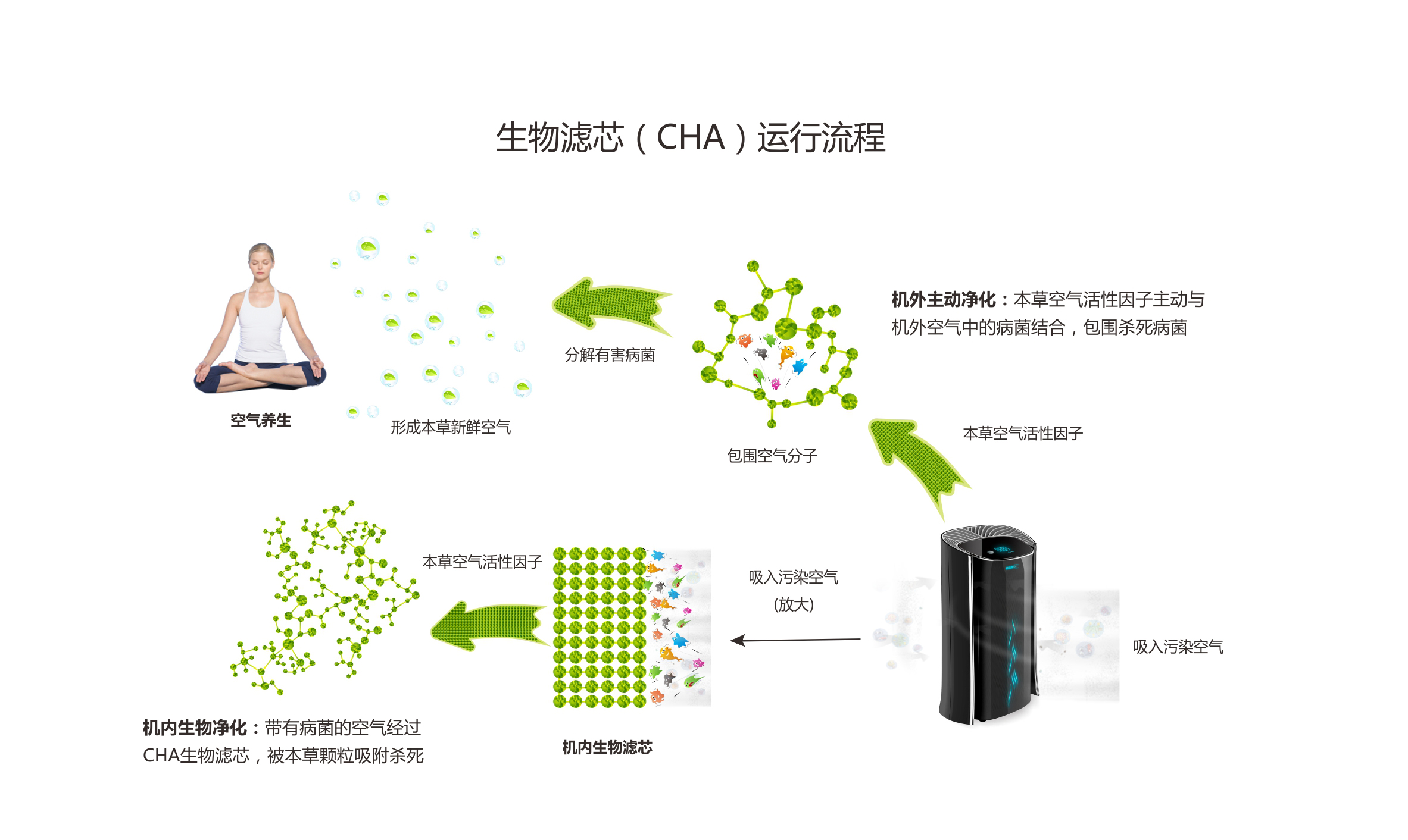 據該技術項目研發首席專家彭康教授介紹,與目前市場流行的HEPA濾網、活性炭等空氣凈化技術相比較,CHA本草凈化技術最顯著的特點是主動式生物凈化。傳統空氣凈化是被動式吸附凈化,有害微生物被吸附在HEPA等物理濾網上,相當于“垃圾筒”式的收集,沒有被殺死。本草空氣凈化具有生物殺菌消毒功能,空氣中有害微生物進入CHA生物濾芯,不僅被過濾,而且被本草活性成份殺死。傳統空氣凈化器凈化工作全部在機內,是被動的,而本草空氣凈化器過濾出來的空氣,因含有中草藥活性揮發成份,在空中還可主動消毒,凈化更加徹底。