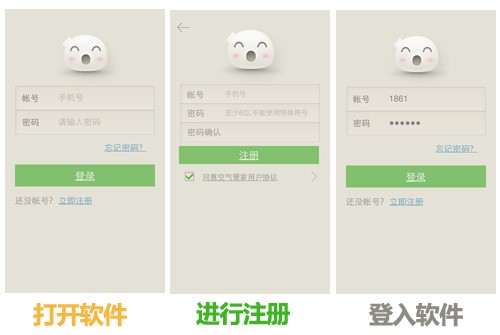 打開空氣盒子APP軟件,首先我們需要進行注冊。輸入您的手機號,設定登陸密碼,就可輕松進入到空氣盒子的控制界面。當然,如果您忘記密碼,還可點擊軟件客戶端上的旺季密碼按鈕,進行密碼的找回,操作簡單便捷。