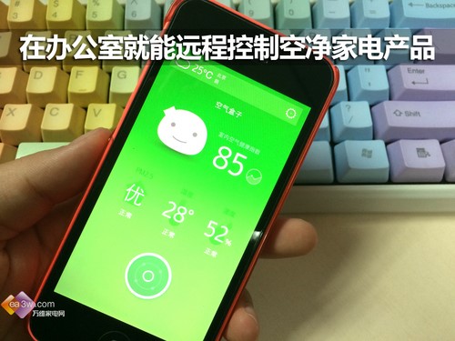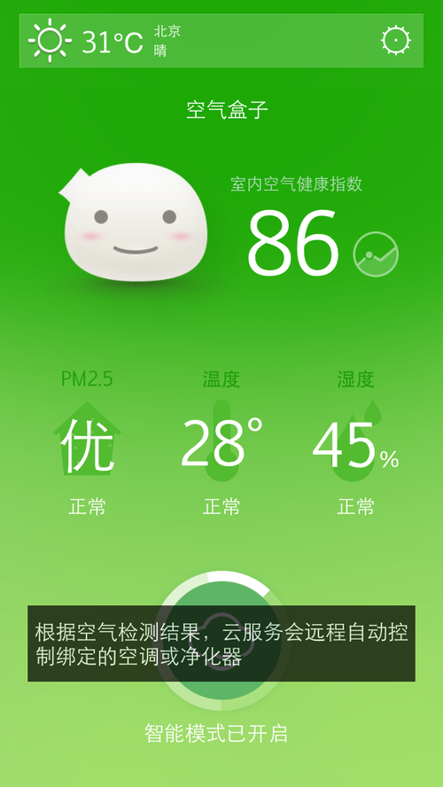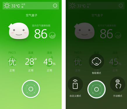 當上述的所有操作都完成以后,就可進入空氣盒子APP客戶端界面,進行室內空氣健康情況的查看,而空氣盒子則會對室內的溫度、濕度、PM2.5健康情況以 及室內整體的健康指數進行時時的檢測,當室內空氣混濁,有害氣體超標時,其就會自動的發出警報,提醒用戶開窗或是開空調、開空氣凈化器,來及時的對室內空 氣進行有效凈化,智能推送與操作,輕松搞定。