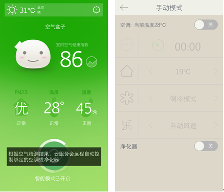 其 次,手動模式,即手動綁定空調和空氣凈化器。點擊手動模式,安裝界面提示進行相關操作,就能輕松的實現空調、空氣凈化器與空氣盒子的配對。當然,當綁定完 空調或者空氣凈化器以后,就可選擇智能模式。即無論何時何地,當您室內空氣較差時,需要開啟相關設備凈化室內空氣時,空氣盒子就會自動的發出指令,智能聯 動家中空調,進行空氣凈化。